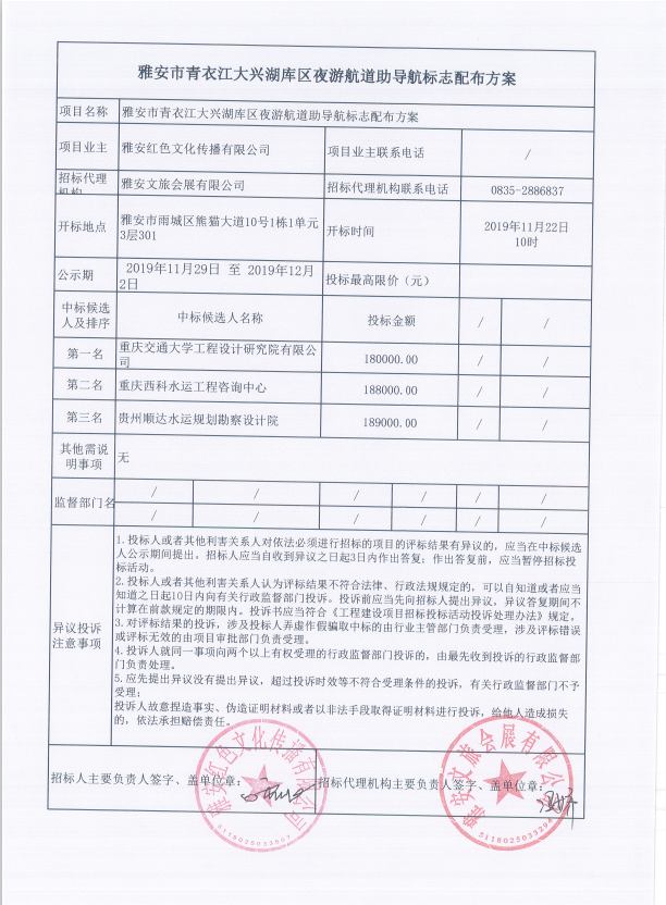 雅安市青衣江大興湖庫區(qū)夜游航道助導航標志配布方案中標公告